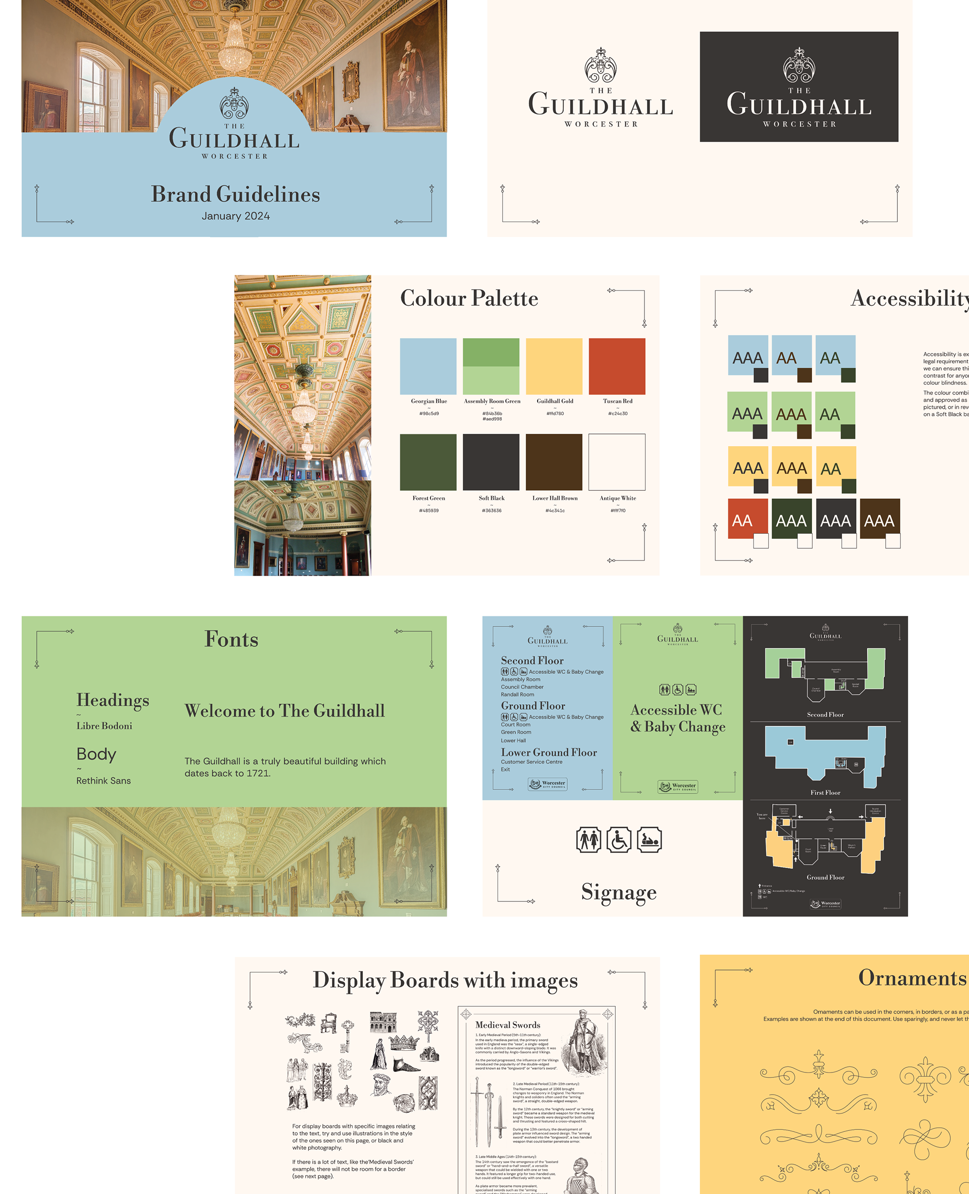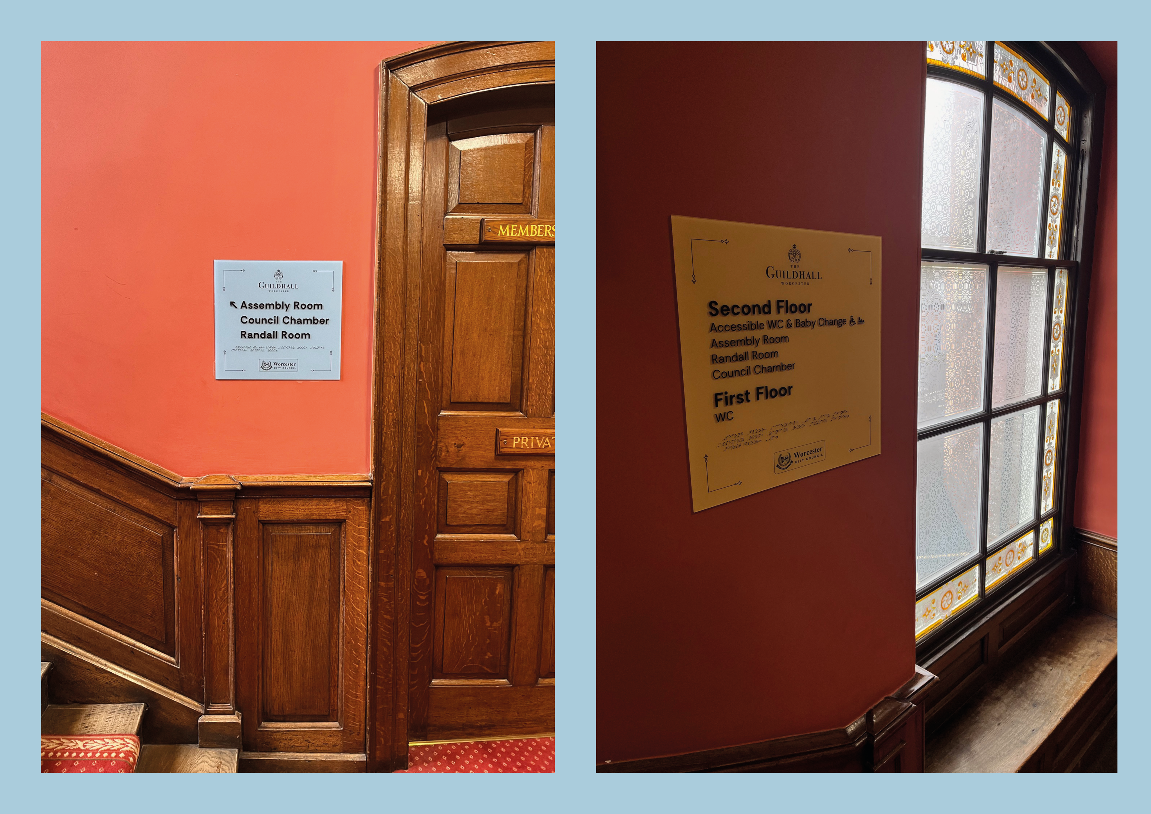 The Guildhall is a council-owned building that is used jointly as council offices, the council chamber, a bookable events space and open to the public. For a building with this many jobs, including earning an income from events, it had never had a clear brand image other than the logo. I created a brand, colour palette inspired by the Assembly Room ceiling and ornate illustrative borders, which were then used to refresh the wayfinding in the building. It was important to us that braille was included, and I was instrumental in sourcing the supplier for this to ensure it was done correctly. We worked directly with the RNIB's team to make the signage as accessible as possible.